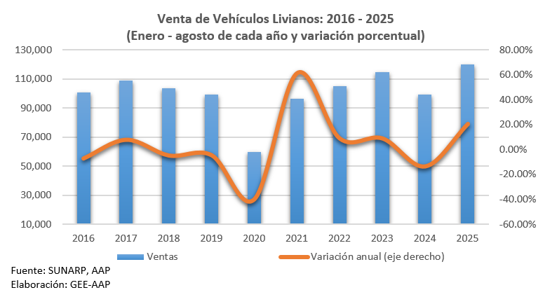 De acuerdo con los datos oficiales proporcionados por la Superintendencia Nacional de los Registros Públicos (Sunarp), la venta de vehículos livianos nuevos alcanzó las 16,185 unidades durante agosto de 2025, lo que representa un incremento del 26.7% en comparación con el mismo mes del año anterior. Asimismo, en el acumulado de los primeros ocho meses del año, la comercialización de dichos vehículos totalizó 119,874 unidades, superando en un 20.6% el volumen registrado en el mismo periodo de 2024.