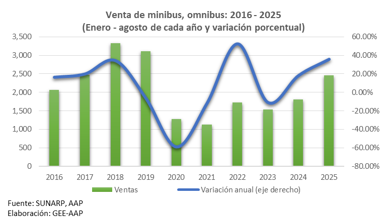 El mercado de minibuses y ómnibus nuevos también ha mostrado una tendencia positiva en lo que va del año, con un desempeño sólido en agosto, mes en el que se comercializaron 289 unidades (+30.8%). En el acumulado de enero a agosto, las ventas ascendieron a 2,462 unidades, reflejando una expansión del 35.9% respecto al mismo periodo de 2024. Este repunte responde a la reactivación de sectores intensivos en transporte de pasajeros, como el turismo y los servicios vinculados (hoteles, restaurantes, entretenimiento), que han retomado su dinamismo tras años marcados por la pandemia, la conflictividad social y fenómenos climáticos. “La ausencia de estos shocks ha permitido una normalización operativa, mientras que el fortalecimiento del consumo interno y la inversión privada en el 2024 y lo que va del 2025 han contribuido a estimular la demanda de movilidad. En este contexto, las empresas del sector vienen optando por la renovación de flotas y la incorporación de nuevas unidades, en un entorno de mayor crecimiento y predictibilidad”, indicó Morisaki.