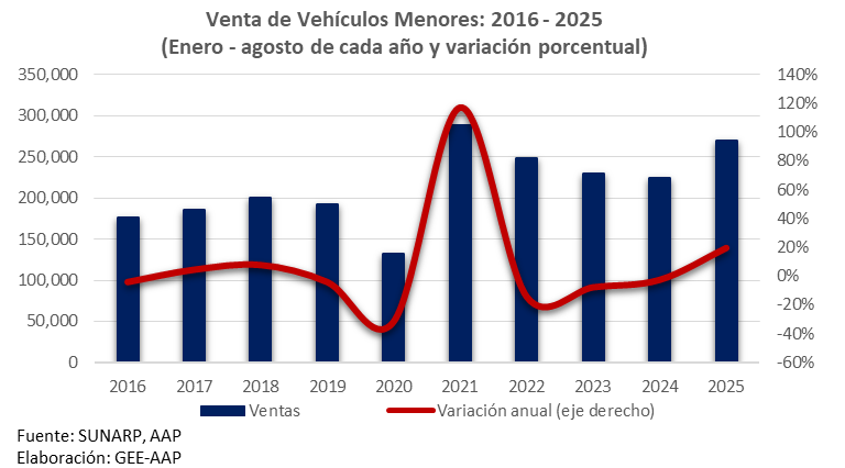 El segmento de vehículos menores continuó mostrando un desempeño destacado en agosto de 2025, al comercializarse 36,918 unidades (+16.2%). Asimismo, en los primeros ocho meses del año, las ventas alcanzaron 269,364 unidades, con una expansión del 19.9% respecto al mismo periodo de 2024. Este crecimiento ha sido liderado por las motocicletas, que concentraron 186,844 unidades (+18.3%), seguidas por las trimotos, con 82,520 unidades (+23.7%).