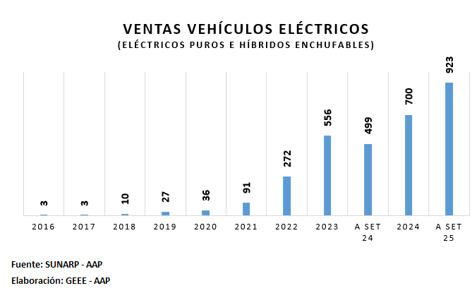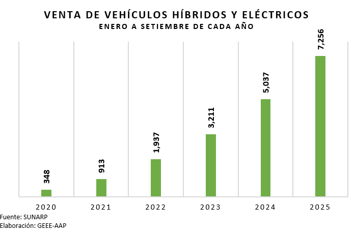Al cierre del tercer trimestre del 2025, la comercialización de vehículos electrificados (híbridos y eléctricos) mostró un avance considerable. Según datos oficiales de la Superintendencia Nacional de los Registros Públicos (SUNARP), en setiembre se registraron 931 unidades vendidas de vehículos híbridos y eléctricos, lo que representó un incremento de 50% respecto al mismo mes del año anterior.
