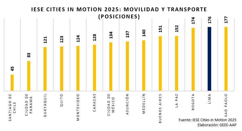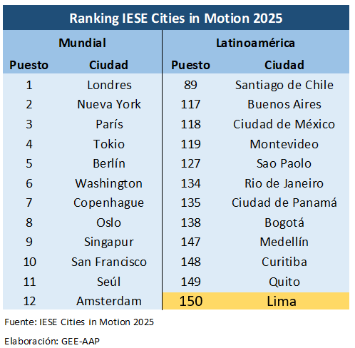 Para la AAP, el informe del IESE confirma que los principales desafíos de Lima son estructurales. “Si no se avanza en movilidad sostenible, planificación urbana y medioambiente, será muy difícil mejorar en gobernanza, cohesión social o competitividad económica”, enfatizó Graña.
