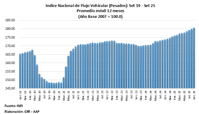 Según el reporte oficial, el Índice de Flujo Vehicular —que registra el tránsito de unidades livianas y pesadas a través de las garitas de peaje— creció 4,4% en comparación con septiembre del año anterior, impulsado por el aumento del tránsito de vehículos livianos (+3,2%) y pesados (+6,1%). La evolución del flujo vehicular confirma la recuperación y dinamismo del transporte en el país, tanto en la movilidad de personas como en el desplazamiento de mercancías”, sostuvo la AAP.