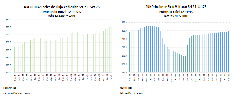A nivel regional, el comportamiento fue igualmente favorable. Arequipa registró un incremento de 16,5% en el tránsito vehicular debido al Día Mundial del Turismo y la celebración de la Virgen de la Merced. Junín aumentó 1,0% impulsado por la festividad en honor a la Virgen de Cocharcas; La Libertad, 10% por el 73° Festival Internacional de la Primavera; Piura, 11,7% debido a actividades culturales y religiosas en honor a la Virgen de las Mercedes; Puno, 6,3% por celebraciones patronales; y San Martín, 9,1% por su aniversario regional y el Festival de la Gastronomía Amazónica.