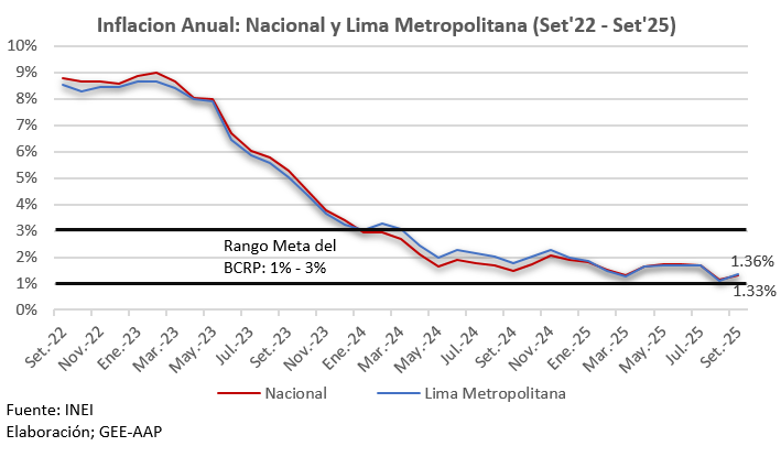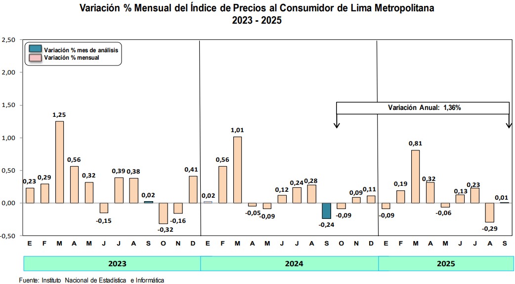En el contexto general, el INEI informó que el Índice de Precios al Consumidor (IPC) de Lima Metropolitana registró un incremento marginal de 0.01% en setiembre, acumulando 1.25% entre enero y setiembre y una inflación anual de 1.36%. Con ello, la inflación se mantiene por décimo mes consecutivo por debajo del punto medio del rango meta del Banco Central de Reserva del Perú (BCRP), ubicado entre 1% y 3%.