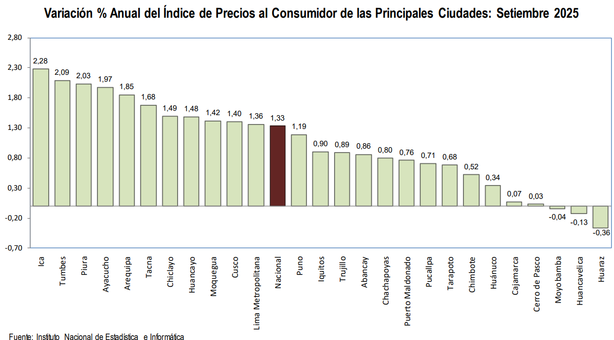 A nivel nacional, el IPC se incrementó en 0.04% en setiembre, con Ica (2.28%), Tumbes (2.09%) y Piura (2.03%) mostrando las mayores inflaciones anuales, mientras que Moyobamba (-0.04%), Huancavelica (-0.13%) y Huaraz (-0.36%) reportaron descensos.