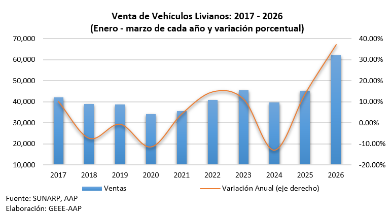 En el segmento de vehículos livianos, se comercializaron 20,510 unidades nuevas en marzo, lo que representó un crecimiento de 38.3% frente al mismo mes del 2025. En el acumulado entre enero y marzo, las ventas alcanzaron las 62,094 unidades, cifra superior en 37.3% respecto de similar periodo del año pasado.