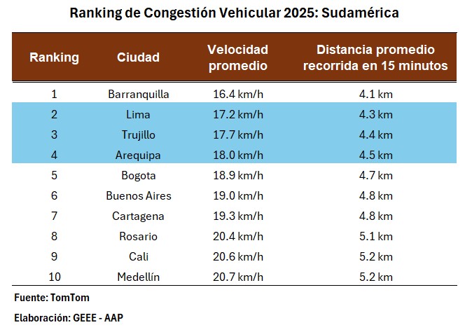Al comparar los datos de 2025 con los de 2024, se evidencia un deterioro en la congestión vehicular en las principales ciudades del país. En Lima, la velocidad promedio cayó de 17.9 km/h a 17.2 km/h; en Trujillo pasó de 18.0 km/h a 17.7 km/h; y en Arequipa disminuyó de 18.9 km/h a 18.0 km/h.