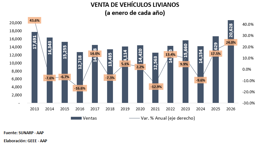 Según cifras oficiales de la Superintendencia Nacional de los Registros Públicos (SUNARP), la comercialización de vehículos livianos nuevos llegó a 20,628 unidades en enero de 2026, lo que representó un récord histórico mensual y un aumento de 24% respecto a enero de 2025.
