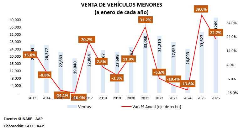 Por su parte, el segmento de motos y trimotos continúa ganando relevancia. Sus ventas alcanzaron 41,269 unidades al cierre del primer mes del 2026, un aumento anual de 22.7%. Este resultado se da en un contexto de mejora de la capacidad adquisitiva de las familias, mayor disponibilidad de stock en un mercado altamente competitivo, tipo de cambio favorable y mayor acceso al crédito, entre otros elementos.