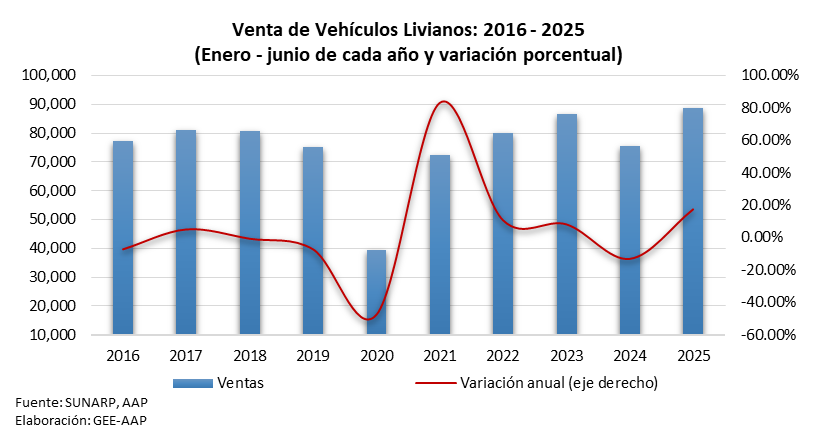 Según información de la Superintendencia Nacional de los Registros Públicos (Sunarp), la venta de vehículos livianos nuevos totalizó 14,709 unidades en junio, lo que representó un crecimiento de 35.7 % respecto a similar mes del 2024. En tanto, en el acumulado enero-junio, se colocaron 88,783 unidades, cifra superior en 17.6 % al mismo periodo del año anterior.