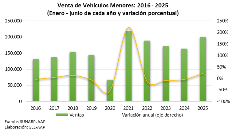 Por otro lado, en junio se vendieron 34,005 vehículos menores nuevos (+36.9 % en comparación con el mismo mes del 2024), mientras que entre enero y junio se comercializaron 200,030 unidades (+21.7 % frente al mismo periodo de 2024). De ese total, 139,535 correspondieron a motos (+21.2 %) y 60,495 a trimotos (+22.9 %). Este desempeño representa el segundo mejor resultado histórico para el periodo, solo por debajo del récord alcanzado en 2021 (217,191 unidades).